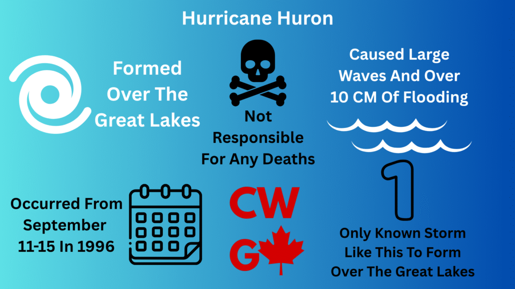 Hurricane Huron, also known as the 1996 Lake Huron Cyclone, the 1996 Great Lakes Cyclone, or “The Hurroncane” was a storm that occurred over the Great Lakes in September of 1996. The storm had the sustained strength as a tropical storm, with some brief gusts reaching hurricane strength. It should be noted that this storm was never officially named “Hurricane Huron” due to not being part of the ‘official’ 1996 hurricane season, but was given that nickname due to the fact that it was at its most powerful while it was over Lake Huron.