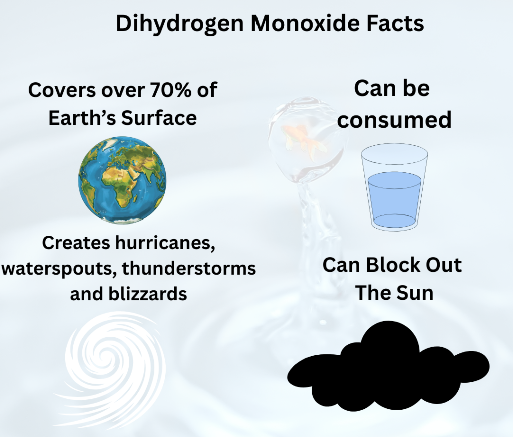 Dihydrogen Monoxide is a naturally occurring compound that is two parts hydrogen (H2) and one part oxygen (O). It can consistently be found on Earth as a solid, liquid, and gas. Its liquid form, which covers over 70% of the Earth’s surface, is one of the few that expands when frozen, which allows its solid form to float when in its liquid form. Most large concentrations of dihydrogen monoxide are filled with large amounts of salt, with much of the rest inaccessible due to being frozen.